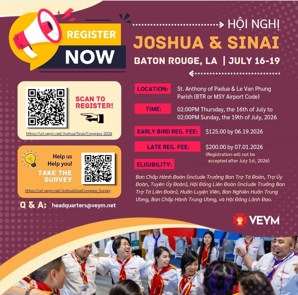 It is with great joy that I announce to you on behalf of the National Executive Committee, the VEYM’s 2026 Joshua (Ban Chấp Hành) and Sinai (Huấn Luyện Viên) Congress to commence this summer in Baton Rouge, LA. In celebrating the 250th anniversary of our nation and in union with the United States Conference of Catholic Bishops’ Evangelization initiative to evaluate, take action, and transform the ways in which we evangelize in the new digital era, the VEYM’s Joshua and Sinai Congress aims to renew our spirit, bolster our work on evangelization, and enkindle a living relationship with Jesus in the most Holy Eucharist. Through dynamic keynote speakers, practical breakout sessions on effective strategies for evangelization, discussions and dialogues on VEYM transformation and advancement, social gathering, praise and worship, music, food, prizes, and much more, those in attendance without a doubt will be motivated and sent forth to lead their chapter into the next chapter in our great history.